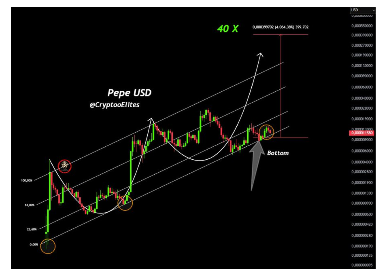 تتمثل أبرز آفاق هذه البنية التقنية في: بمجرد أن يتجاوز سعر PEPE بنجاح مقاومة الحد العلوي للقناة، قد يؤدي ذلك إلى تسارع صعودي على شكل منحنى. توضح الرسوم البيانية بوضوح الاتجاه المحتمل بعد الاختراق - من المتوقع أن يقفز السعر من حوالي 0.000011 دولار إلى حوالي 0.0004 دولار، محققًا هدف ارتفاع بنسبة 40 ضعف كما توقع @CryptoELlTES. إذا تحقق هذا السيناريو، ستدخل PEPE في قائمة أفضل العملات الميمية أداءً في هذه السوق الصاعدة، وقد يكون نطاق ارتفاعها مماثلاً للأسعار التاريخية لكل من DOGE( وSHIB).