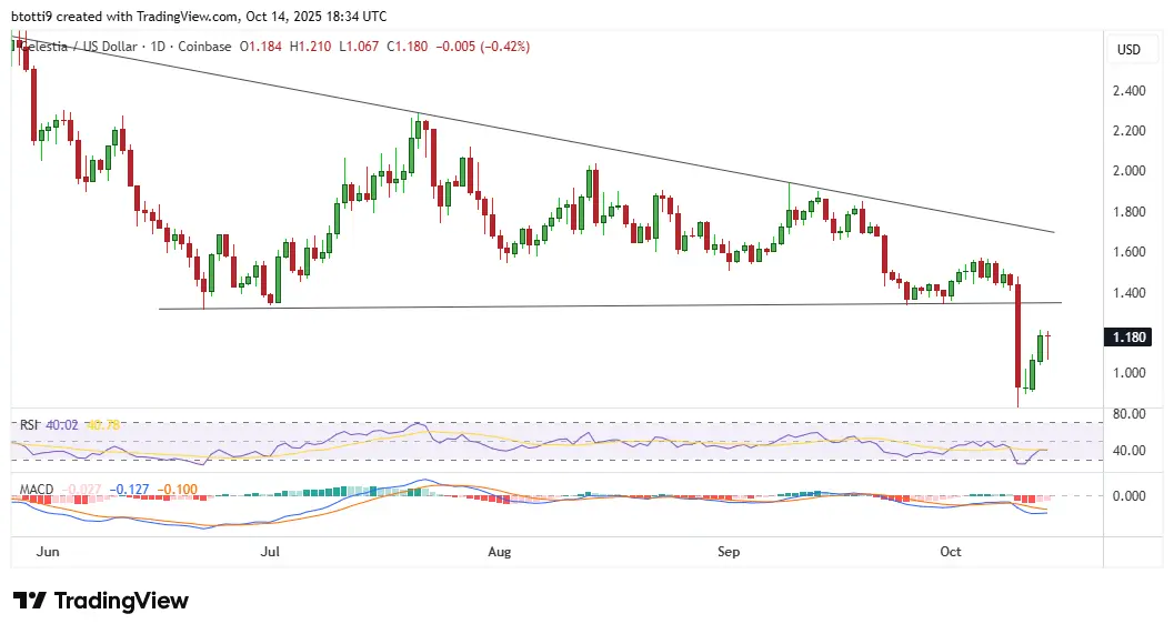 • ارتفع رمز TIA الخاص بـ Celestia مرة أخرى إلى $1 في 14 أكتوبر 2025، بعد انخفاض حاد إلى 0.27 دولار في 10 أكتوبر.