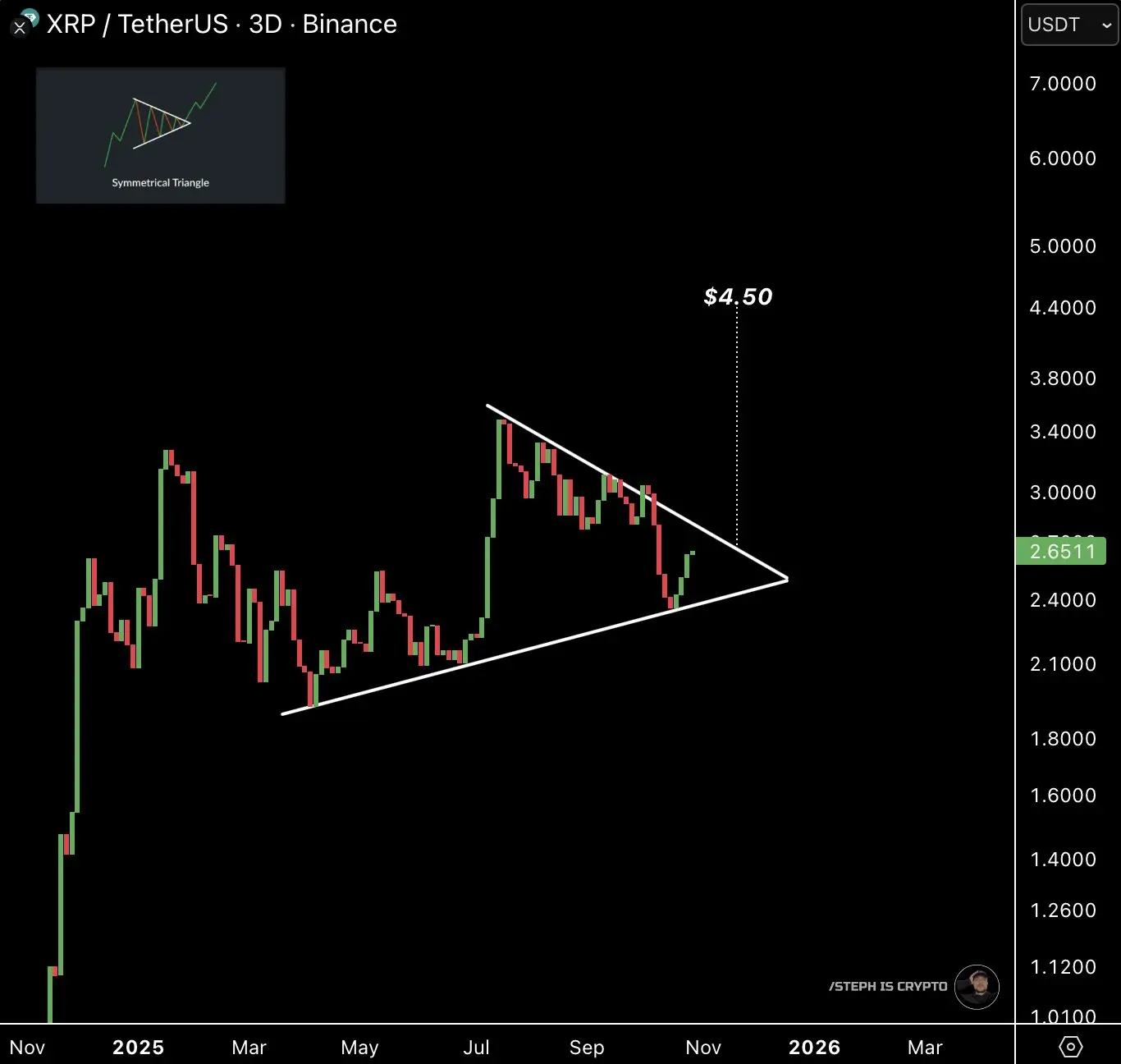 وفقًا للتاجر STEPH IS CRYPTO، يظهر نمط السوق الحالي أن نطاق سعر XRP يضيق بشكل متزايد، بين مستوى الدعم عند 2.40 دولار ومستوى المقاومة عند 3.00 دولار. يُعتبر هذا النطاق الضيق التعبير الأكثر وضوحًا عن شكل مثلث متناظر. في مخطط XRP لمدة ثلاثة أيام المقدم من بينانس، يمكن رؤية شكل المثلث المتناظر بوضوح، وهو نمط تقني كلاسيكي يُشير عادةً إلى أن حركة سعر قوية في اتجاه واحد على وشك الحدوث.