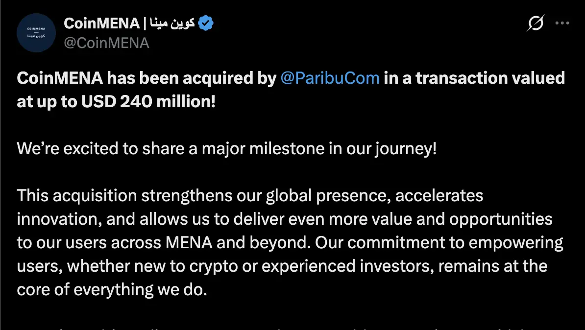 أكملت عملاق العملات الرقمية التركية باريبو أكبر عملية استحواذ في مجال التكنولوجيا المالية في تركيا، بشراء CoinMENA، أكبر بورصة عملات رقمية مرخصة محليًا في الشرق الأوسط وشمال إفريقيا، في صفقة نقدية بالكامل تصل قيمتها إلى $240 مليون.