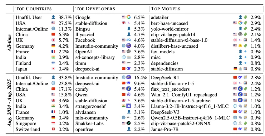 Un estudio realizado en diciembre de 2025 por MIT mostró que China lidera en número de cargas mundiales de IA de código abierto, con un 17,1%. La cifra de EE. UU. es del 15,8%.