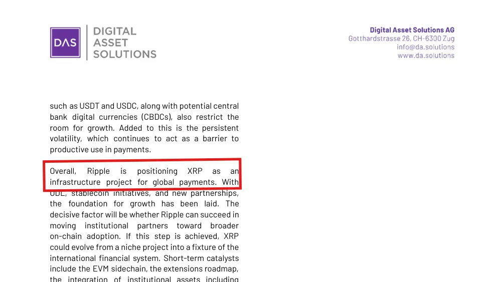 El documento de investigación de DAS afirma que Ripple posiciona XRP como infraestructura clave para pagos globales