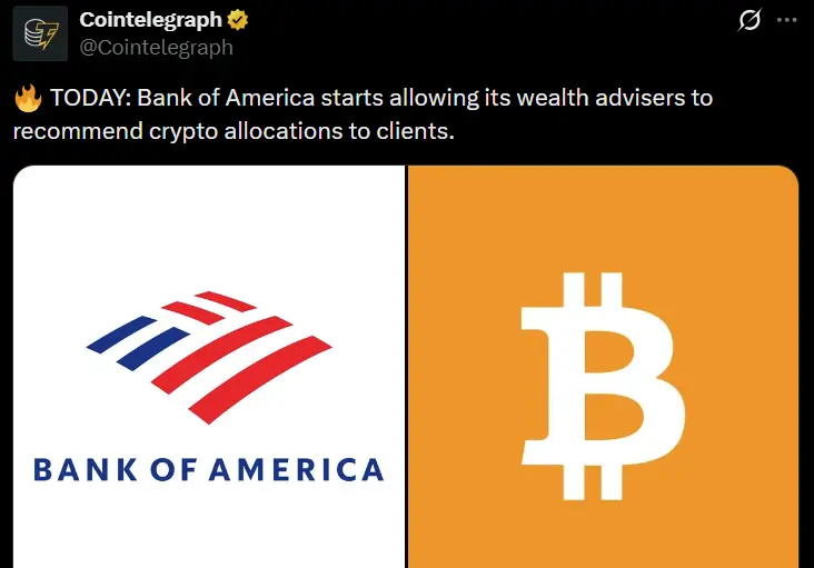 Cette décision intervient environ un mois après que Bank of America aurait conseillé à ses clients en gestion de patrimoine d’allouer entre 1 % et 4 % de leur portefeuille aux actifs numériques.