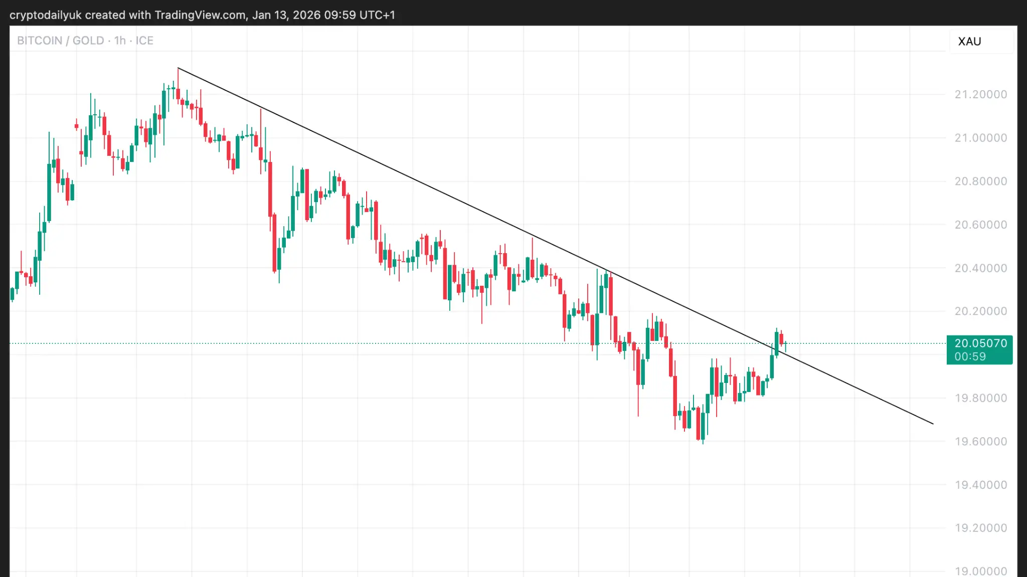 En zoomant sur le cadre horaire très court du ratio Bitcoin/or contre l’or, on peut voir que le BTC vient de dépasser une tendance baissière face à l’or. Bien sûr, il s’agit d’un cadre très court, donc la prudence est de mise, mais sur le cadre hebdomadaire élevé, 19 onces constituent le support principal pour le BTC face à l’or. 25 onces représentent le prochain grand niveau de résistance. Surveillez Bitcoin pour qu’il commence à rééquilibrer la balance face à l’or à partir de maintenant.