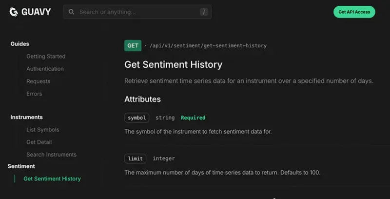 L’API de Guavy est conçue pour l’IA agentique avec un support natif pour le protocole de contexte de modèle (MCP) et les standards LLMs.txt. Cela permet aux développeurs d’intégrer sans effort le sentiment en temps réel, les actualités et les signaux de trading directement dans les flux de travail des agents IA et les applications de grands modèles de langage sans middleware complexe ni logique de parsing personnalisée.