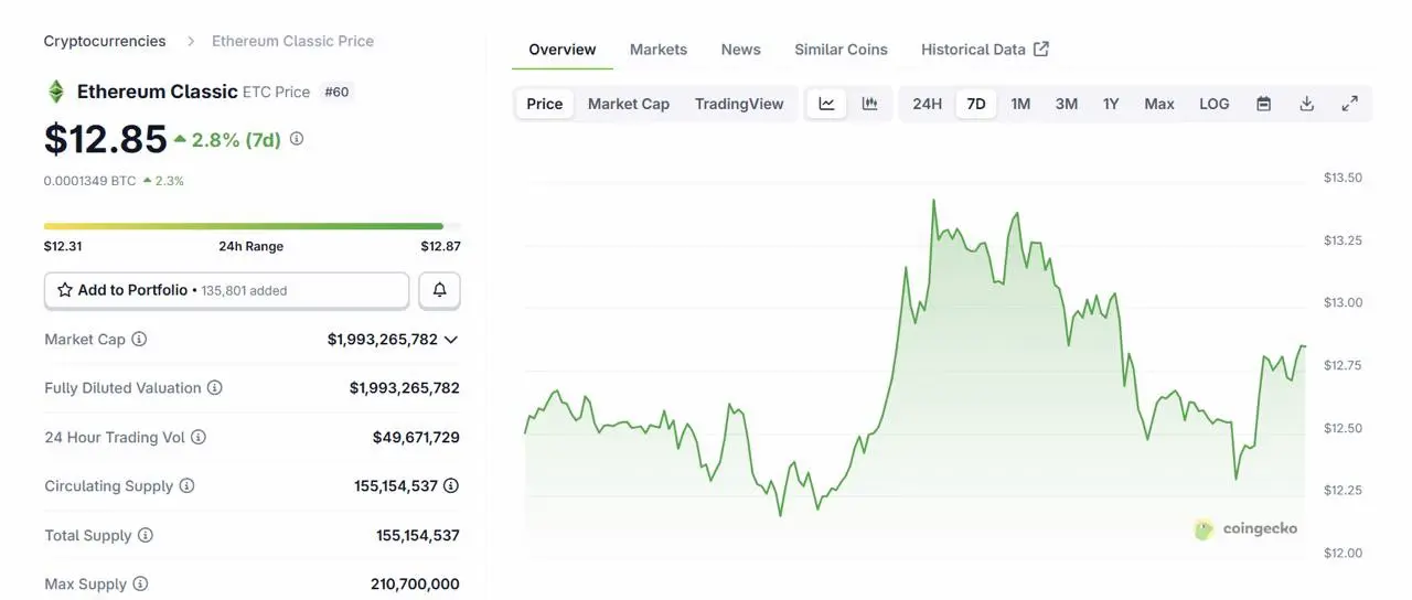 Ethereum Classic reste fidèle aux principes sur lesquels il a été fondé, notamment l’immutabilité et la sécurité par preuve de travail. En janvier 2026, le prix de l’ETC oscille entre $12 et 13 $, reflétant un intérêt modéré mais stable.
