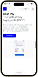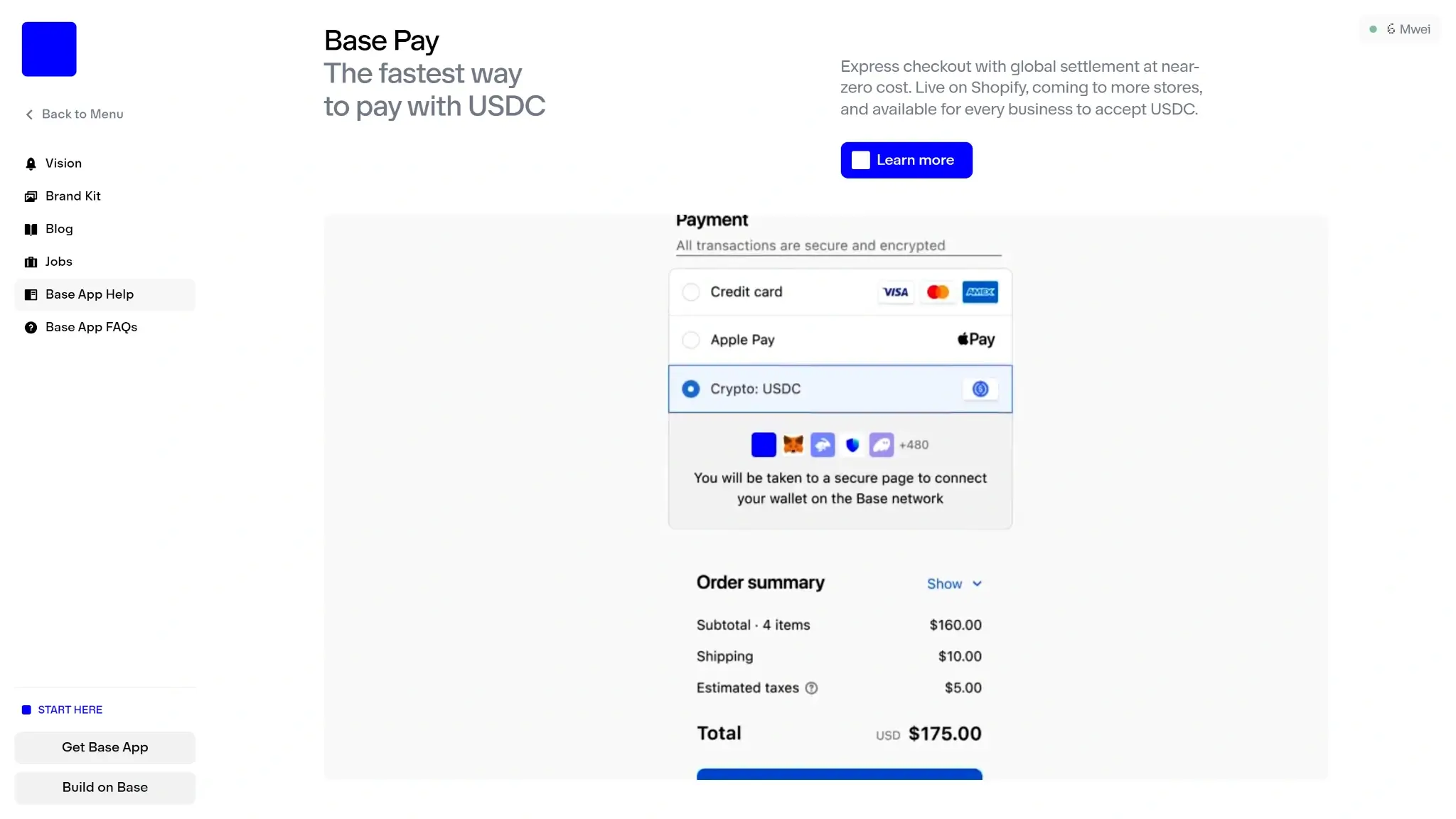 Page de paiement Base montrant le flux de paiement USDC avec carte, Apple Pay et options crypto.