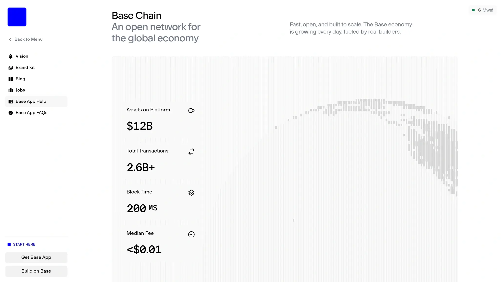 Page de la chaîne Base montrant des statistiques réseau comme actifs sur la plateforme, transactions, et frais médians.