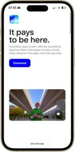 Page de téléchargement de Base App avec le slogan “Ça vaut le coup d’être ici” et un bouton de téléchargement.
