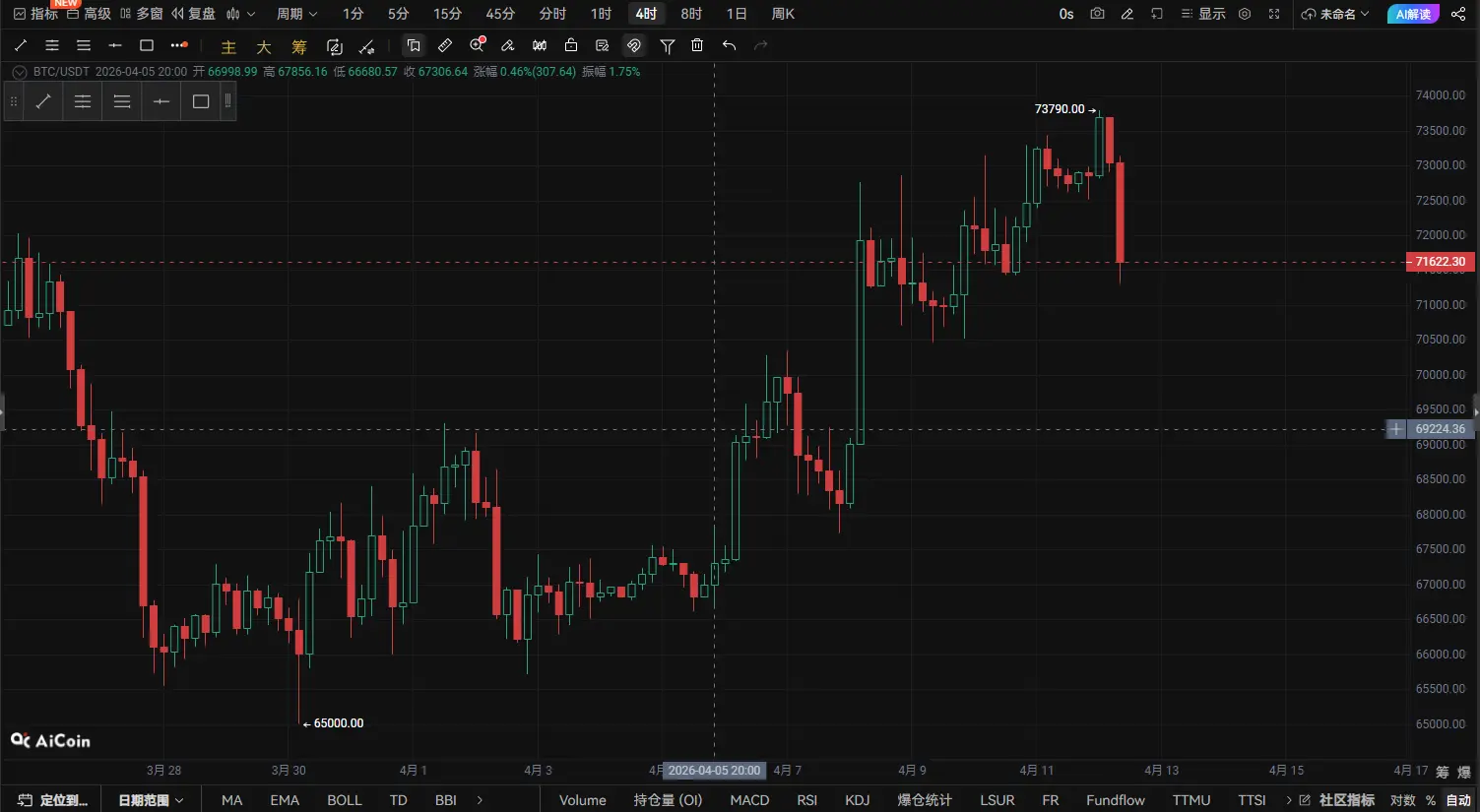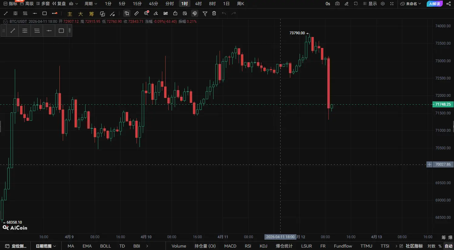 BTC tiba-tiba mengalami koreksi besar-besaran! Gagal menembus tinggi di 74.000, pertarungan antara bullish dan bearish di garis pertahanan kunci 71.000 (Analisis pasar 12 April)