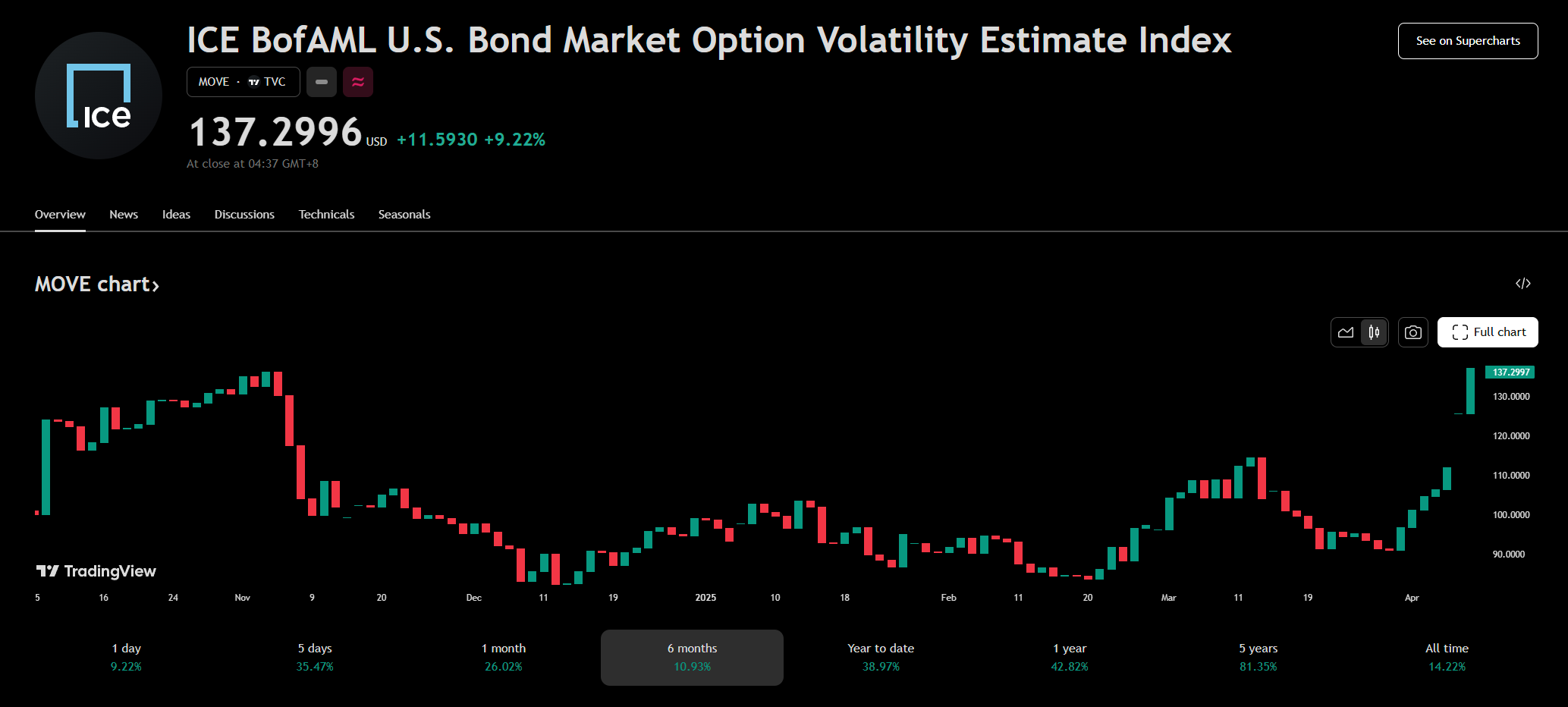一方で、市場の信号は緊張感を高めています。Tradingviewのデータによると、債券のボラティリティ指数(MOVE Index)は4月8日に137ポイントを突破し、「7連続上昇」を記録し、Arthur Hayesが予測した140ポイントの「臨界線」に近づいています。Hayesは警告しました:「MOVE Indexが上昇すれば、レバレッジ国債およびコーポレート債のトレーダーはマージン要件の引き上げにより強制的に売却を余儀なくされる。これはFRBが必死に守っている市場です。140を突破することは、崩壊後の緩和のサインです。」現在の指数はこの閾値まであと一歩であり、債券市場の圧力が蓄積されていることを示唆しています。