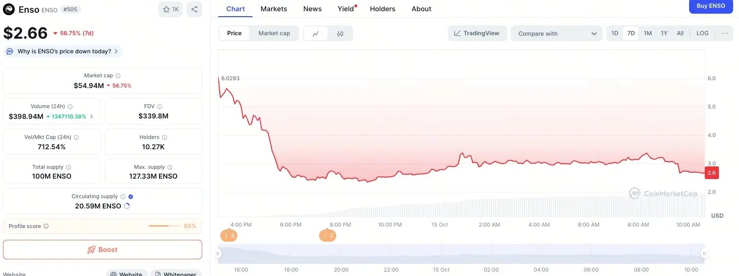 しかし、市場の反応は異常に厳しかった。プロジェクトのローンチに伴い、Enso のネイティブトークン ENSO がイーサリアムと BNB チェーンで初めて登場した。オープニング価格は一時 6.02 ドルの高値に達したが、その後は滝のように下落し始めた。記事執筆時点で、ENSO は 2.68 ドルを記録しており、オープニングの高値から 54% 以上の大きな下落を示している。この「上場即ピーク」の動きは、多くの期待していた投資家を驚かせ、Enso の価格予測に対する広範な疑問を引き起こした。