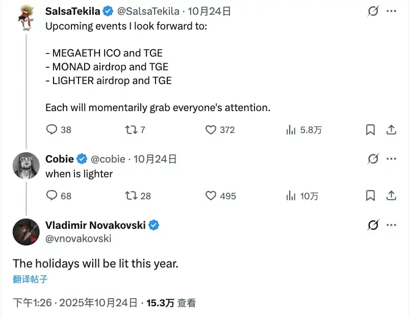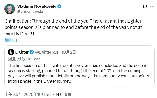 先月中旬、Lighterの創設者兼CEO Vladimir NovakovskiはYouTubeのロシア語AMAで、第2シーズンのポイント活動はTGEまで続くと述べた。彼が以前Xプラットフォームで言及した「ポイント活動は年末前に終了するが、12月31日まで続かない」という発言や、「今年のホリデーは盛り上がるだろう」(今年の休暇は素晴らしいものになる)とのコミュニティへのコメントから、エアドロップの時期に対する期待が一層明確になった。