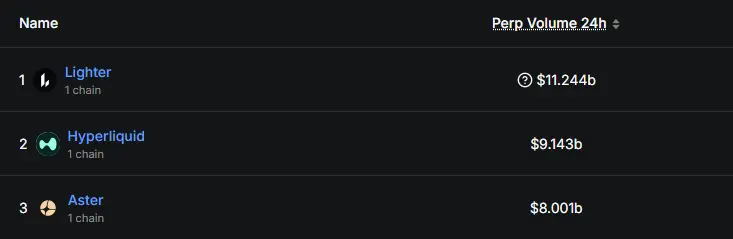 このニュースの影響で、未発行のLighterは一時、「毛狩り党」の目から最も取引量を稼ぐべきPerp DEXプロジェクトとして注目された。DefiLlamaのデータによると、Lighterの24時間取引量は110億ドルを突破し、Perp DEXのトップに立った。次いでHyperliquid(91億ドル)、Aster(80億ドル)が続いている。