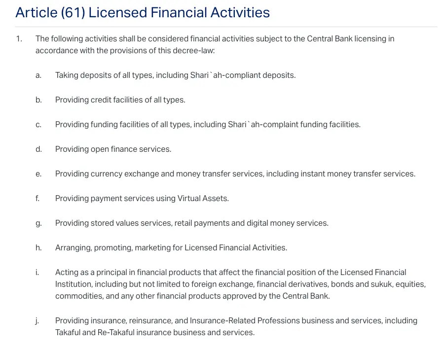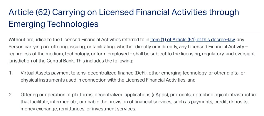 その主要な規定である第61条および第62条は、UAE中央銀行からのライセンスを必要とする活動のリストを提供しています(CBUAE)、暗号決済やデジタル預かり価値を含みます。
