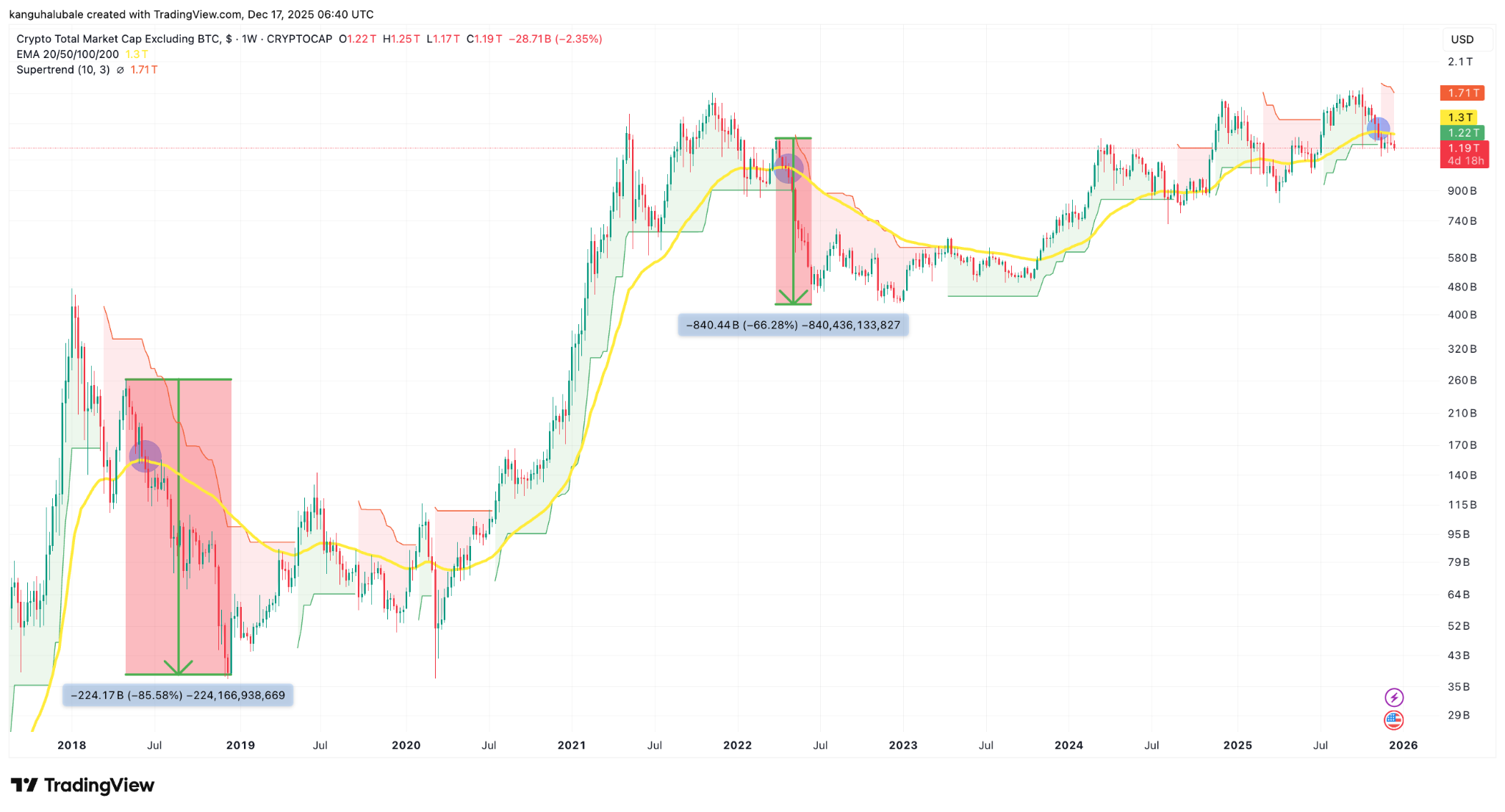 この下落により、TOTAL2は重要なサポートレベルを失い、50週の指数移動平均(EMA)は現在1.3兆ドルに達しています。以下のチャートに示されています。