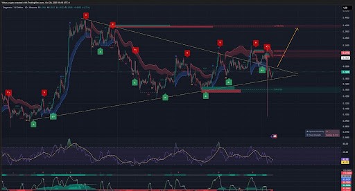緑の強気のドットとRSIのブレイクアウトは、新しい上昇トレンドの可能性についての最初の強いシグナルを示唆しています。チャートでは、RSIラインが重要なレベルを突破しており、これは通常、価格の上昇前に発生します。チャートはまた、ドージコインの価格が三角形の形を形成している様子を強調しており、ブレイクアウト矢印が次の価格ゾーンに向かって上向きに指しています。