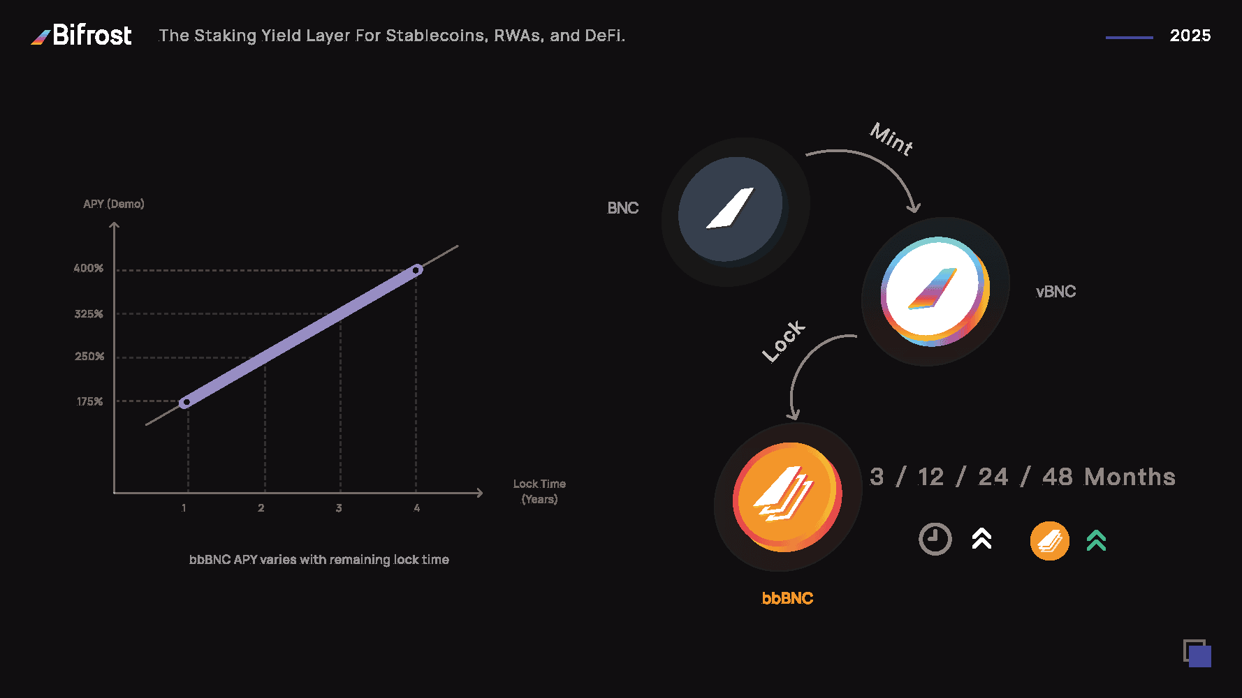 bbBNCとは何でしょうか?それは譲渡不可のトークンであり、収益分配の代表バウチャーです。ユーザーはBNCやvBNCをロックすることでbbBNCを獲得できます。より長期間、より多くのトークンをロックするほど、多くのbbBNCが付与されます。このモデルはCurveのveCRVを彷彿とさせ、報酬が主に長期信奉者や一貫した貢献者――コミュニティの真の支柱――に流れることを保証します。これは、インセンティブを整合させ、献身的なステークホルダー基盤を醸成する強力なメカニズムです。