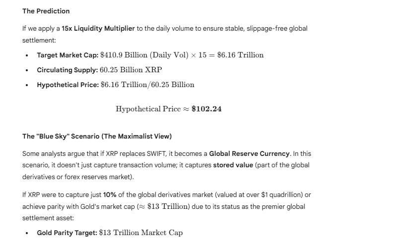 Source: CryptoNewsNetOriginal Title: Here’s What 3,000 and 7,000 XRP Could Be Worth If SWIFT Corridors Migrate to RippleNetOriginal Link: ## SWIFTコリドーがRippleNetに移行した場合のXRP価格への影響は何か?過去数年にわたり、XRPの支持者や業界リーダーは、XRPが最終的にSWIFTと連携するのか、またはネットワークを置き換えるのかについて議論してきました。### XRPはSWIFTと連携できるのか?例えば、2015年にRippleのチェアマン、クリス・ラーセンはGlobal Finance Magazineに対し、Rippleはリアルタイム決済のためにあらゆる通貨の支払いネットワークを接続し、SWIFTやACHなどの既存システムと並行して動作できると述べました。さらに、今年初めにRippleのCEO、ブラッド・ガーリングハウスは、XRPが今後5年間でSWIFTの取引量の14%を獲得できる可能性があると述べました。これらのコメントは、ネットワークの支払いを促進するSWIFTコリドーがRippleNetに移行した場合に、XRP価格がどのように反応するかの評価につながっています。### SWIFTコリドー背景として、SWIFTコリドーは、異なる国や通貨の金融機関間の直接支払いルートを表します。SWIFTネットワーク上で約40,000のルートが運営されており、150以上の通貨と200以上の国や地域をカバーしています。最新のデータによると、2024年には約40,000のコリドーが存在し、年間跨境価値は約$150 兆ドルに上ります。これは世界のGDPの約1.5倍に相当します。また、2025年中旬時点で、ネットワークは毎日4700万件以上のメッセージを処理しています。特に、卸売支払いの約60%は、SWIFTメッセージ送信後1時間以内に宛先口座に到着します。2025年初頭時点で、最も利用される通貨はUSDで全体の50%、EURで23%、CNYは4%未満です。一方、SWIFTは最近も拡大を続けており、日次メッセージ数は2015年の約3200万から2025年中旬には4700万を超えています。さらに、2025年の年間取引額は$125 兆ドルに達すると予測されており、年率4%の成長を示しています。このネットワークは、ほぼ3日に一度、世界GDPと同等の金額を動かしています。また、SWIFTは2025年11月にISO 20022への移行を発表しました。### SWIFTコリドーがRippleNetに移行した場合のXRP価格この規模を踏まえ、最近、SWIFTコリドーが最終的にRippleNetに移行した場合の仮想通貨資産の反応を評価しました。分析時点でXRPは$2.04で取引されていました。概要を把握するために、Google Geminiに頼りました。Geminiは、RippleNetが年間$150 兆ドルの取引を処理するモデルを作成しました。これには、取引の効用と、金融機関が大きな価格変動を避けるために必要な流動性の深さの両方を考慮する必要があると説明しています。つまり、資産は、世界的な支払いを安定して決済できるだけの市場価値を保持している必要があります。Geminiによると、年間$150 兆ドルの取引量は1日あたり約4109億ドルに相当します。分析者はまた、これらの計算において「流動性乗数」を適用することが一般的です。通常のユーティリティシステムでは、迅速な決済により価格は低く抑えられますが、これは資産が1日に何度も動くためです。しかし、金融機関のシステムでは、深い流動性が重要です。伝統的なFX市場は、しばしば日次取引量の10倍から20倍の市場価値を保持しています。これを踏まえ、Geminiは15倍の乗数を使用しました。1日あたり4109億ドルの要件に15を掛けると、理論的な時価総額は約6.16兆ドルとなります。流通供給量は602.5億XRPなので、このモデルは1XRPあたり約102.24ドルと示しています。一方、より楽観的な見通しでは、世界の準備金やデリバティブを考慮します。もしXRPが世界のデリバティブ市場の10%を獲得した場合($1 兆ドル超)や金の市場規模の$13 兆ドルに匹敵する場合、このモデルはXRPを約215.76ドルと見積もっています。### 3,000と7,000 XRPの価値はどれくらいかこのシナリオが実現した場合に、特に3,000から7,000XRPを保有する個人投資家がどれだけ利益を得られるかを示しています。現在の価格で、3,000XRPは$6,120の価値がありますが、これが$300,000から$645,000に跳ね上がる可能性があります。この増加により、保有者は$293,880から$638,880の利益を得ることができます。一方、7,000XRPを保有する投資家は、現在の価値$14,280から、$700,000から$1.505百万まで増加し、利益は$685,720から$1.49百万となる見込みです。ただし、これらの予測は、XRPがSWIFTの取引量の100%を獲得し、金融機関がXRPを買ってすぐに使用するのではなく、保有し続けると仮定しています。このシナリオは、SWIFTがブロックチェーンの選択肢を模索し続ける一方で、CBDCやプライベートステーブルコインの競争も同様の決済目標を追求しているため、実現の可能性は低いと考えられます。