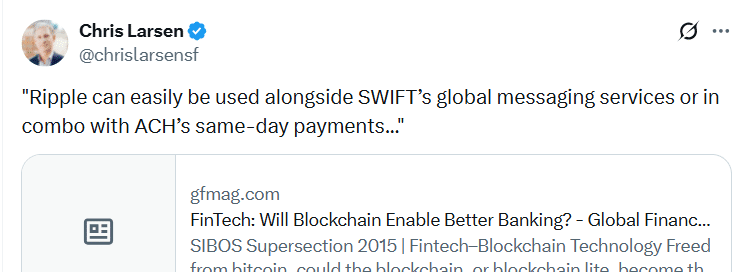 例えば、2015年にRippleのチェアマン、クリス・ラーセンはGlobal Finance Magazineに対し、Rippleはリアルタイム決済のためにあらゆる通貨の支払いネットワークを接続し、SWIFTやACHなどの既存システムと並行して動作できると述べました。