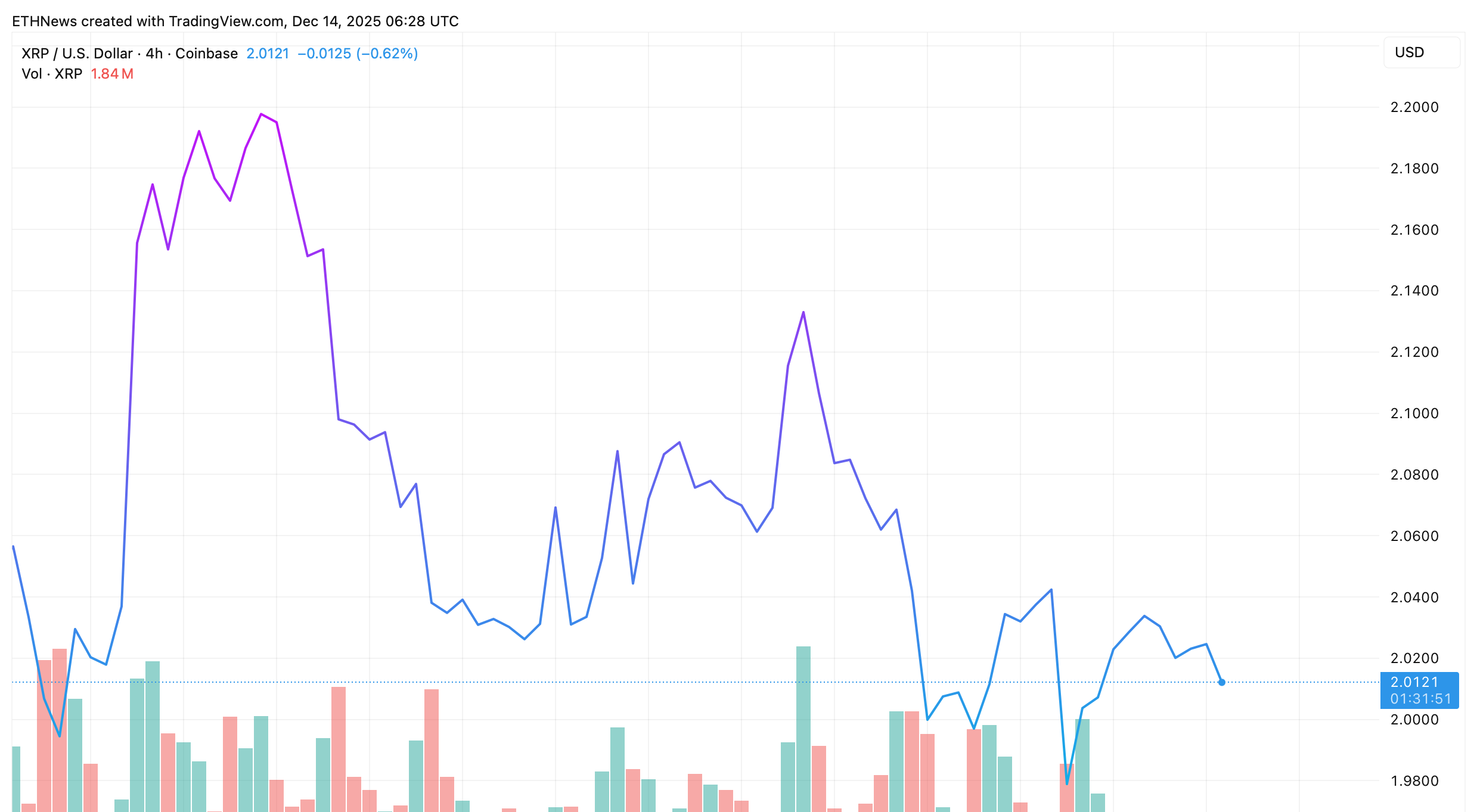 XRPは、過去のセッションで$1.95から$2.15の間で変動しており、決定的な下落は見られません。取引は乱高下していますが、より大きな統合チャネルの範囲内に留まっています。