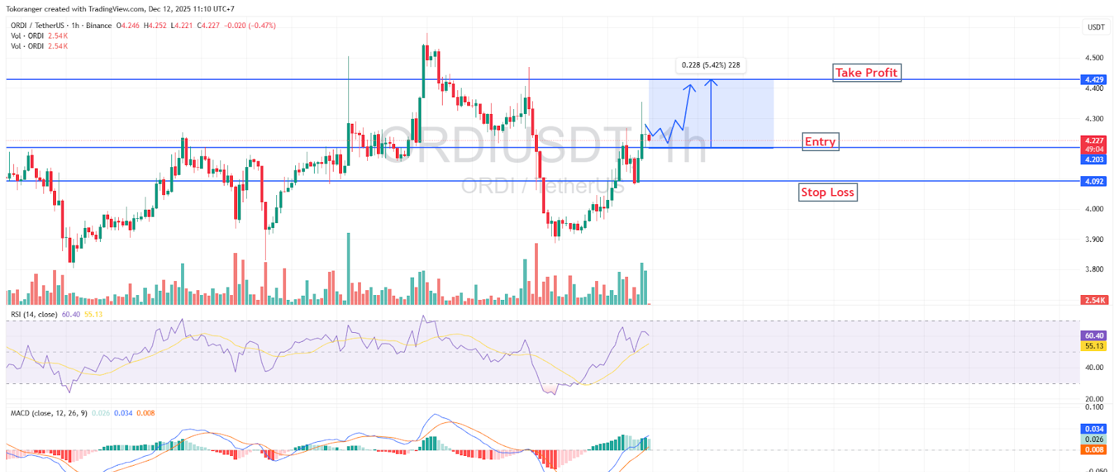 ORDIはサポートレベル$4.09から反発し、かなりの回復力を示しています。現在の価格は$4.20-$4.23の範囲で安定して推移中です。小規模な高値が徐々に持ち上がる形状が現れ始めており、買い手が市場のリズムを再び掌握しつつあることを示唆しています。RSIは売られ過ぎ領域から反発し、50-60の範囲に回復しており、上昇エネルギーの形成を裏付けています。MACDも強気のゴールデンクロスを示しており、上昇の勢いが継続する兆しです。