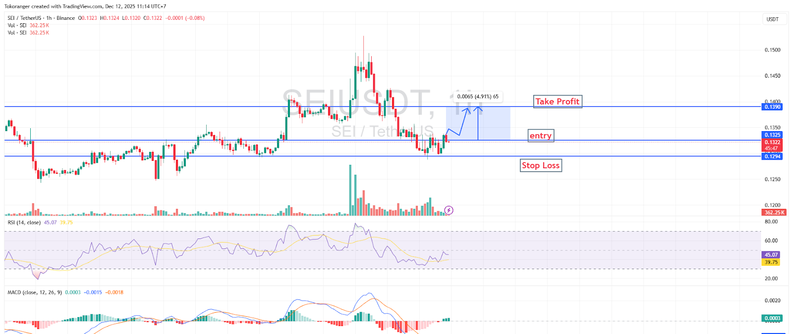SEIはサポートレベル$0.1294から成功裏に反発し、上昇構造を築いています。価格がエントリーゾーン$0.1325に近づくにつれて、出来高も緩やかに増加しており、買い手の再活性化を示しています。RSIは中位にありつつも上昇傾向を形成し始めており、MACDも弱気の赤色ヒストグラムが縮小した後、エネルギーの回復が期待されています。