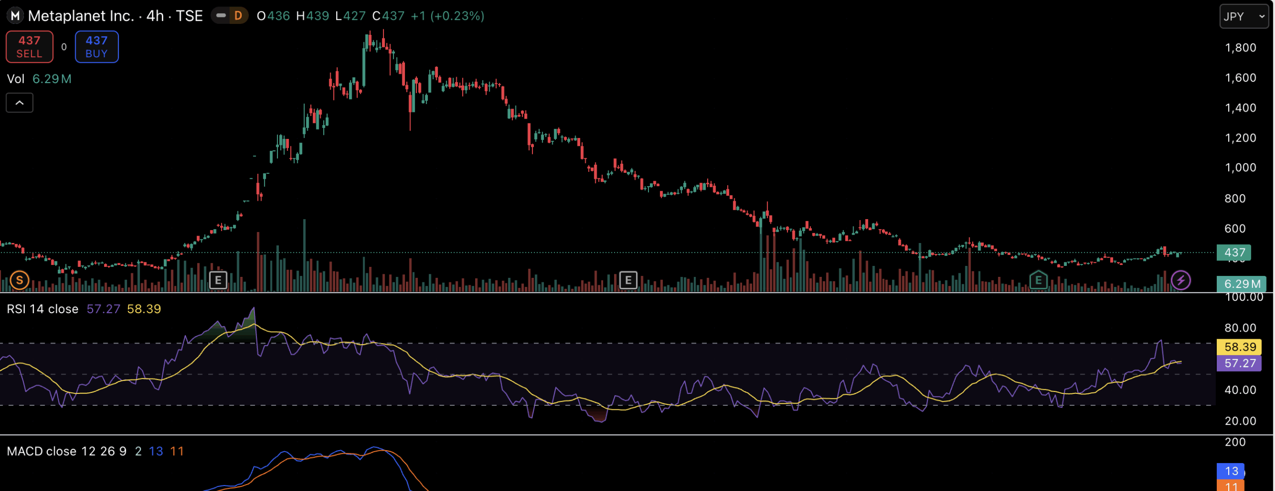 市場の視点から見ると、価格動向は様子見の姿勢を反映しています。Metaplanetの株価は、今年初頭の急騰とその後の長期的な下落の後、調整局面に入っています。現在の¥430〜440付近の取引ゾーンは短期的なサポートエリアとして浮上しています。