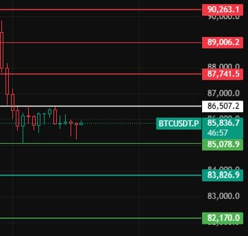 二、各币种具体分析(以下点位仅供参考) BTC: 关键位:86,500(站稳可尝试短多) 支撑阶梯:85,080 → 83,830 → 82,200 压力区间:87,740 → 89,000 → 92,260