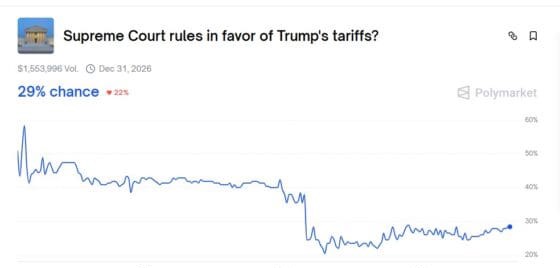 20日(現地時間)、世界最大の予測市場によると、「米最高裁判所がトランプの関税に有利な判決を下すか?」という質問に対する賛成確率はわずか29%だった。これは最高裁が関税課税を違法と判断する確率が71%に達していることを意味する。
