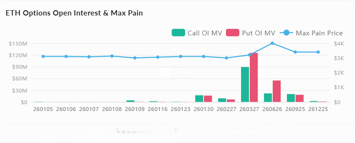 オプション市場:総未開きインタレストは71億ドル(+2.4%)で、最大痛点3,100ドルは主要なサポートレベルと一致し、満期日前に磁力効果を発揮する可能性があります。