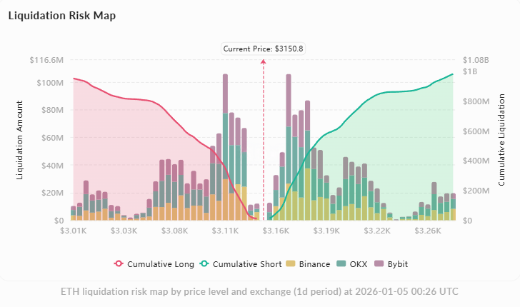 清算リスクマップ: ショートは$3,166以上に$980M+の清算圧力を蓄積し、強気は$3,007を下回る9億5,000万ドル+の清算圧力を蓄積し、非対称的な下落リスクを示しています。 3,160ドルを上抜けるとショートスクイーズ連鎖反応を引き起こす可能性があります。