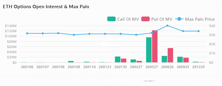 オプション市場総未決済インタレストは76億ドル(+3.4%)で、最大の課題は3,100ドルから3,200ドルの範囲に集中しており、満期直前に価格の固定効果がある可能性があります。