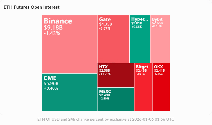 オープンインタレスト:総保有総額は416億ドルで、24時間でわずかに1%減少、バイナンスは92億ドル(-1.4%)、バイビットは26億ドル(-0.2%)で、わずかなデレバレッジが見られます。