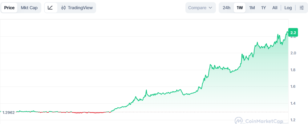 ブレイクアウトが成立したことで、トレーダーはより高い拡張レベルに注目しています。127.2%のフィボナッチ拡張は約$2.23の重要な上昇ターゲットとして浮上し、一方で$2.00は心理的な抵抗ゾーンとして、短期的な価格上昇を抑制する可能性があります。
