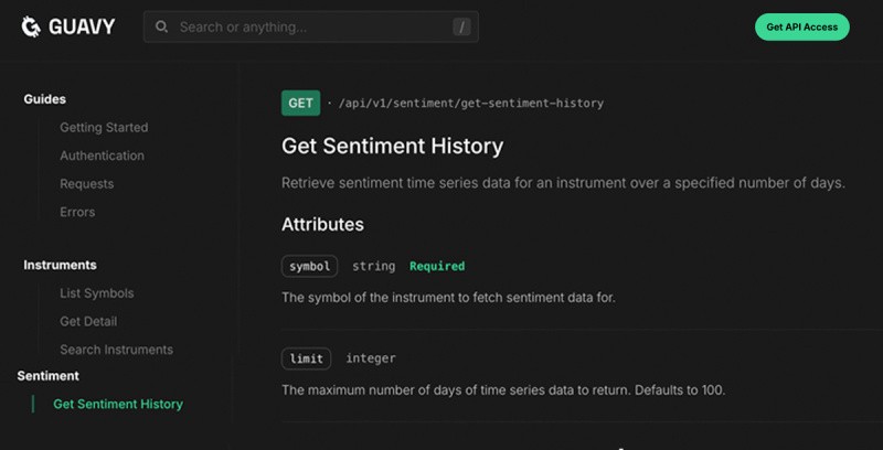 GuavyのAPIは、Model Context Protocol (MCP) とLLMs.txt標準にネイティブ対応したエージェント型AI向けに構築されています。これにより、開発者は複雑なミドルウェアやカスタムパースロジックを必要とせずに、リアルタイムのセンチメント、ニュース、取引シグナルをAIエージェントのワークフローや大規模言語モデルアプリケーションにシームレスに統合できます。