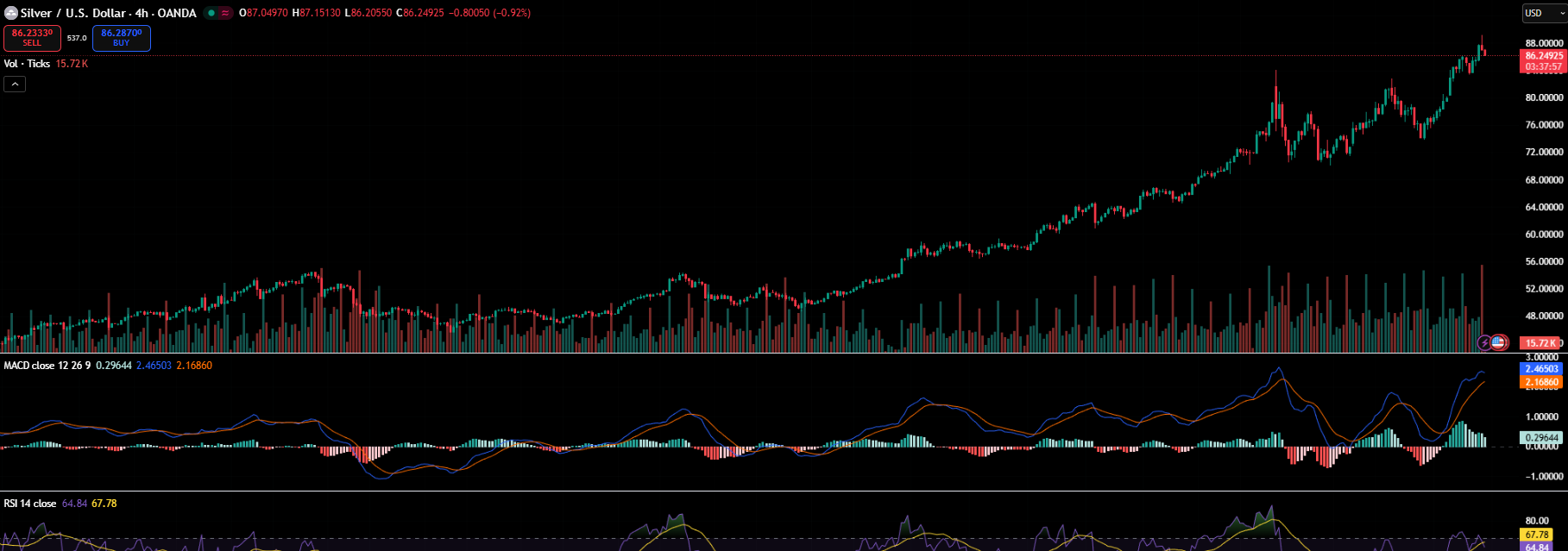 テクニカル指標は引き続き強い上昇圧力を示しています。アナリストは、持続的な蓄積パターンと急激な上昇トレンド構造を指摘し、現時点では買い手がコントロールを握っていることを示唆しています。ただし、高まる勢いの指標は、銀がますます過剰な領域に入っていることも意味しています。