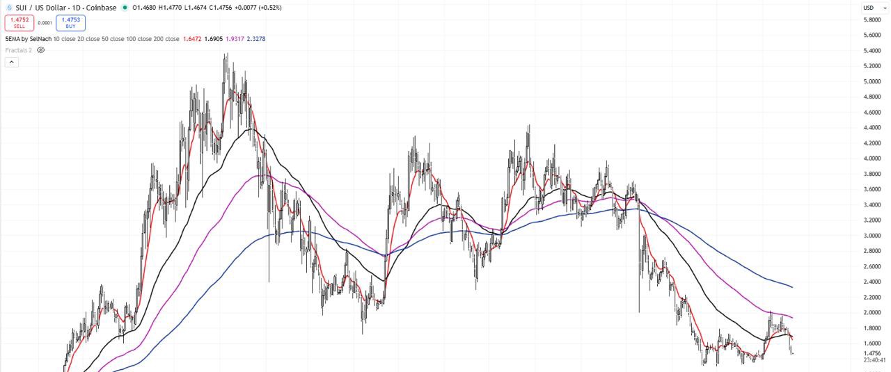 Suiは高速取引と消費者規模のアプリケーション向けに設計された高性能レイヤー1です。これは「新」世代のレイヤー1の一部です。しかし、市場は2021年と同じ生き物ではなく、チャートが全てを物語っています。2025年初頭以来、SUIは長期的な下落トレンドにあり、もはや買うべきトップアルトコインではありません。