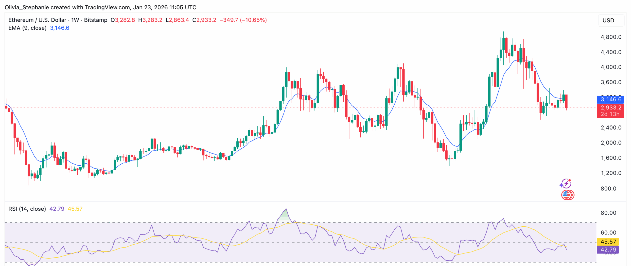 現在、ETHは9週間指数移動平均線の下で取引されており、これは約$3,150付近です。このレベルを維持できない場合、短期的なトレンドは圧力の下に留まることになります。資産はこのラインを取り戻す必要があります。