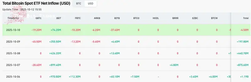 ETFの流入データによると、IBITは10月6日に$970 million、10月7日に8億9,940万ドル、10月8日に4億2,620万ドル、10月9日に2億5,550万ドル、10月10日に7,420万ドルを記録しました。
