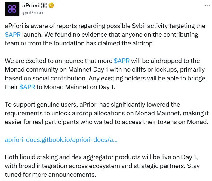 APriori, “gerçek kullanıcıları” ödüllendirme amacıyla Monad Mainnet airdrop'u için uygunluk gereksinimlerini düşürdü, ancak Cuma günü katkıda bulunan ekipten veya vakıftan herhangi birinin airdrop'u talep ettiğine dair “hiçbir kanıt bulamadığını” açıkladı.