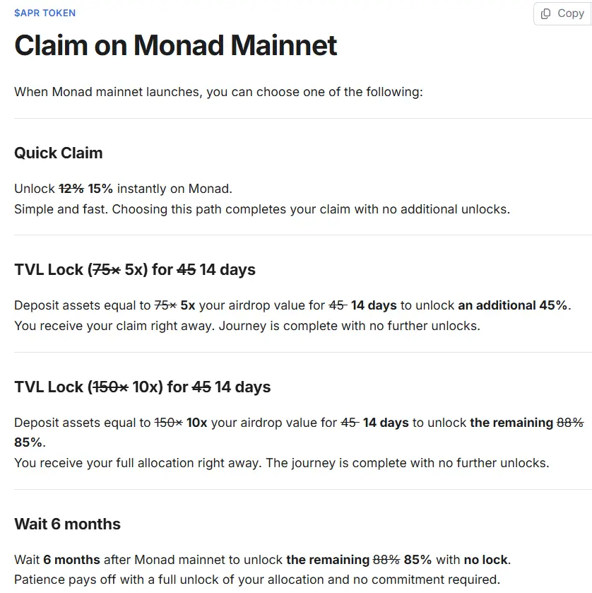 APR token talebi Monad Mainnet üzerinde. Kaynak: apriori-docs.gitbook.ioKullanıcılar, tam tahsisatlarını açmak için airdrop değerlerinin 10 katına eşit varlıkları 14 gün boyunca yatırabilirler, bu da onları taleplerinin kalan %85'ini açma hakkına sahip yapacaktır.