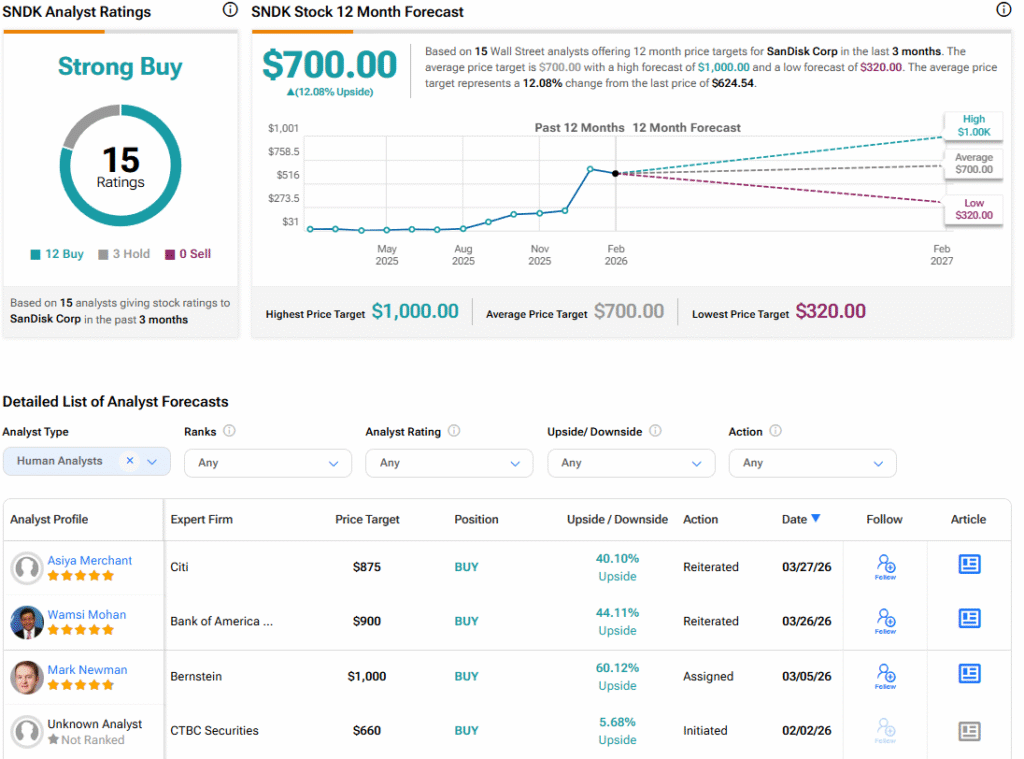 Turning to Wall Street, the analysts’ consensus rating for SanDisk Corp is Strong Buy, based on 12 Buy and three Hold ratings over the past three months. With that comes an average SNDK stock price target of $700, representing a potential 12.08% upside for the shares.