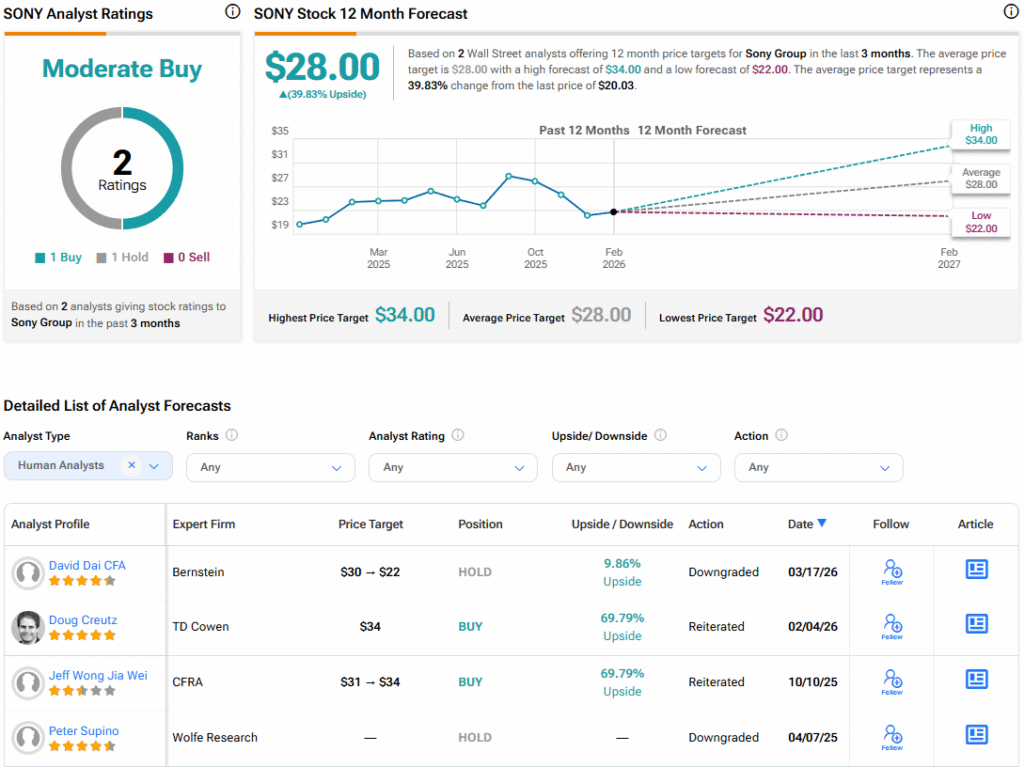 Turning to Wall Street, the analysts’ consensus rating for Sony is Moderate Buy, based on one Buy rating and one Hold rating over the past three months. With that comes an average SONY stock price target of $28, representing a potential 39.83% upside for the shares.