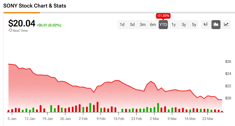 Sony stock was relatively flat on Friday, with the shares only up 0.02% as of this writing. However, the stock has fallen 21.8% year-to-date and 20.17% over the past 12 months.