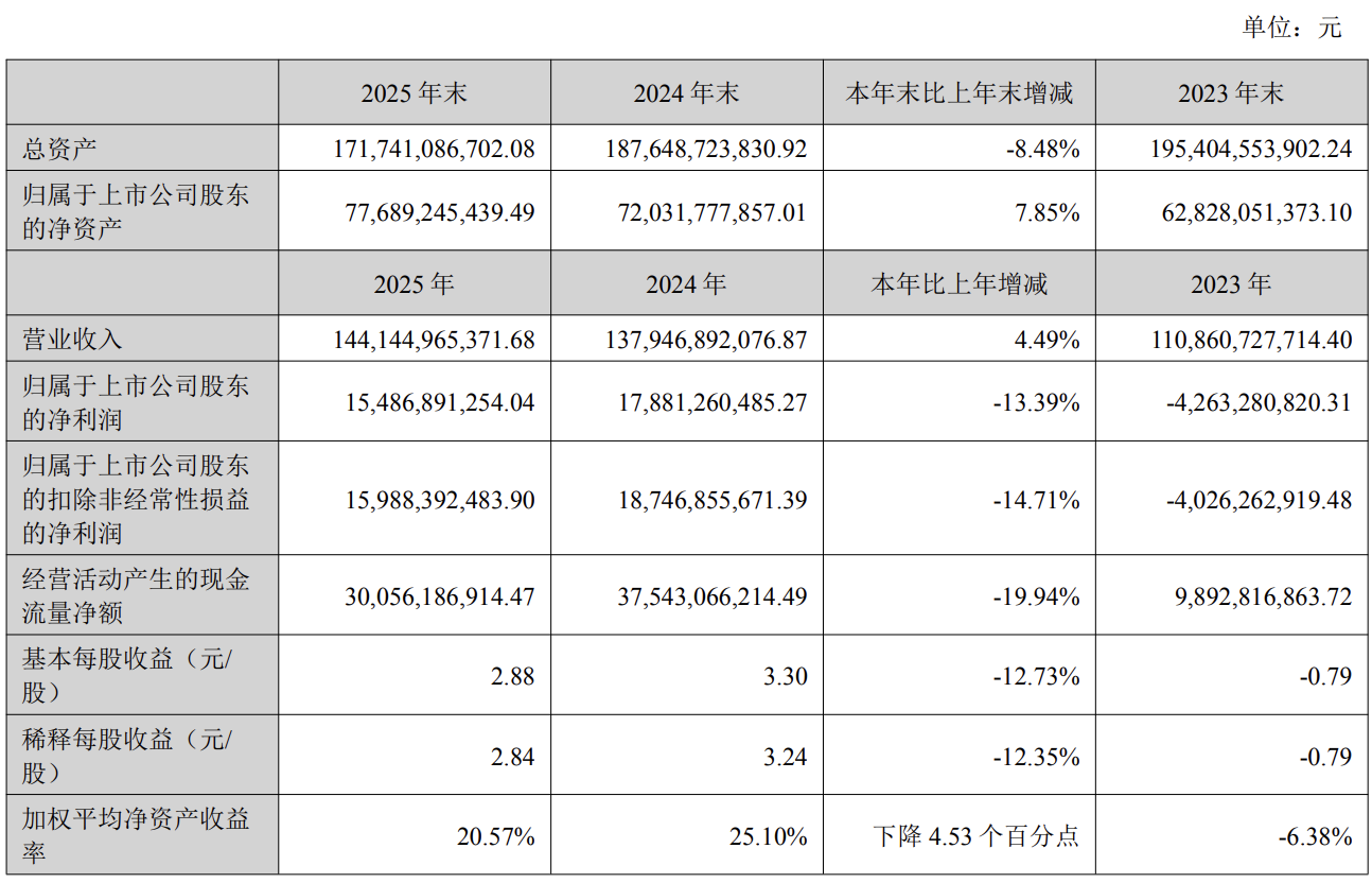 In terms of shareholder returns, the company implemented two equity distributions during the reporting period, totaling 8.085 billion yuan in dividends and completed a share repurchase of about 2 billion yuan. The profit distribution plan disclosed in this annual report for 2025 is a cash dividend of 4.27 yuan for every 10 shares (including tax), with a total dividend amount of about 2.435 billion yuan.