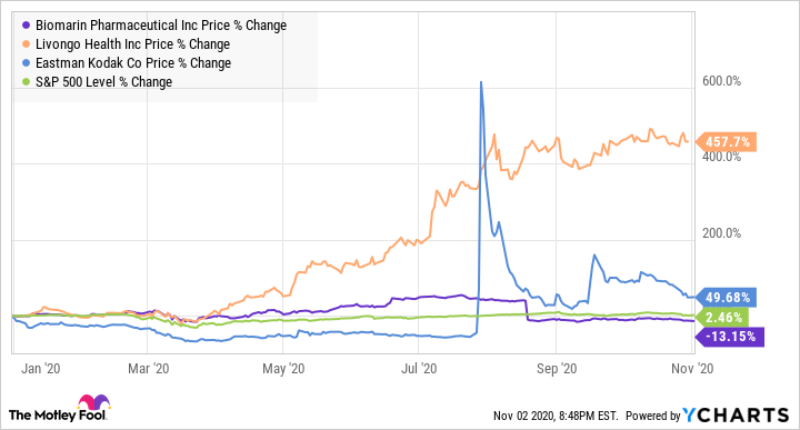 While 2020 has been a year many would like to forget for various reasons, stocks are back near record levels, and the precipitous drops in the darkest days of March are, for the most part, a memory. Share prices aside, some companies and their investors will be happy to turn the calendar to a new year as soon as possible. Eastman Kodak (KODK +11.26%), BioMarin Pharmaceutical (BMRN 1.98%), and Livongo **Health **(LVGO +0.00%) are three companies eager to put 2020 behind them.