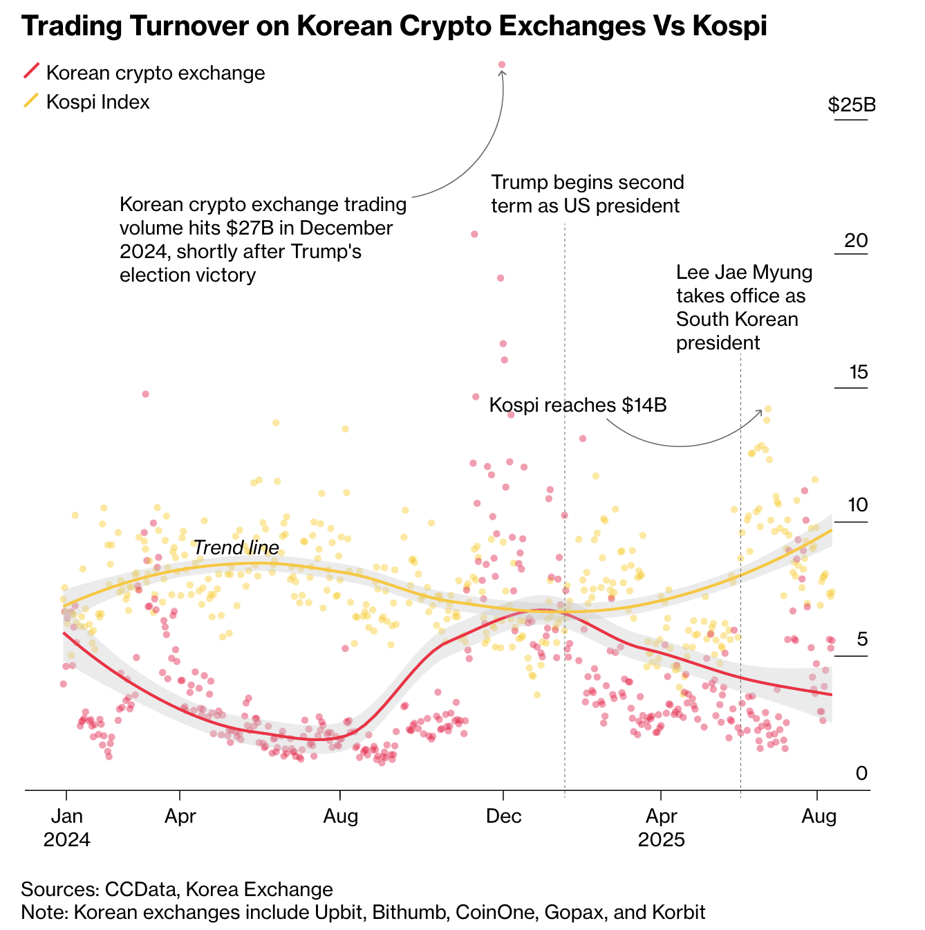 Hoje, o won coreano tornou-se na segunda maior moeda de negociação de criptomoedas a seguir ao dólar, e os investidores de retalho na Coreia estão ainda mais interessados em especular com “moedas de small-cap”. Segundo a Bloomberg, a “exército de formigas” (cerca de 14 milhões de investidores de retalho) está a ser arrastada por preços elevados de imóveis e ansiedade económica, perseguindo ativos de alto risco, desde ETFs alavancados a criptomoedas e até altcoins extremamente voláteis. Nos últimos cinco anos, o volume de empréstimos de margem triplicou, com uma grande quantidade de fundos a sair de contas bancárias e a entrar nestes mercados de alto risco. A popularidade dos investidores de retalho na Coreia faz com que, nas trocas locais, as negociações de altcoins representem mais de 80% do volume, muito acima da média global (que normalmente combina Bitcoin e Éter em cerca de 50%).