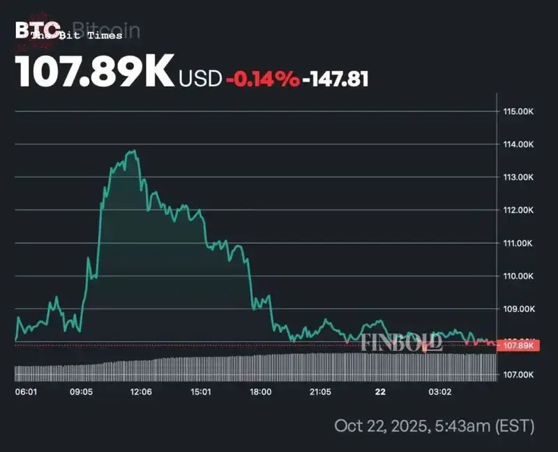 No momento da publicação, Bitcoin está a negociar a $107,890, em queda de 0,14% no gráfico de 24 horas e mais de 4% na semana.