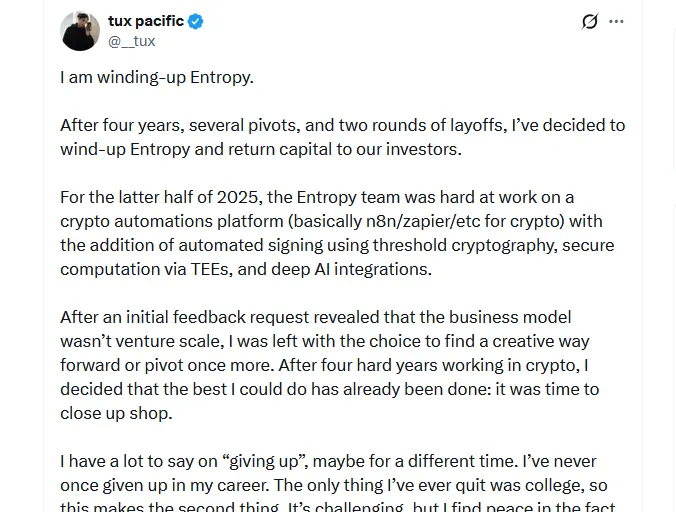 O fundador e CEO da Entropy, Tux Pacific, publicou no X no sábado que a plataforma de automações de criptomoedas não tem um caminho viável para o futuro após anos de operação.